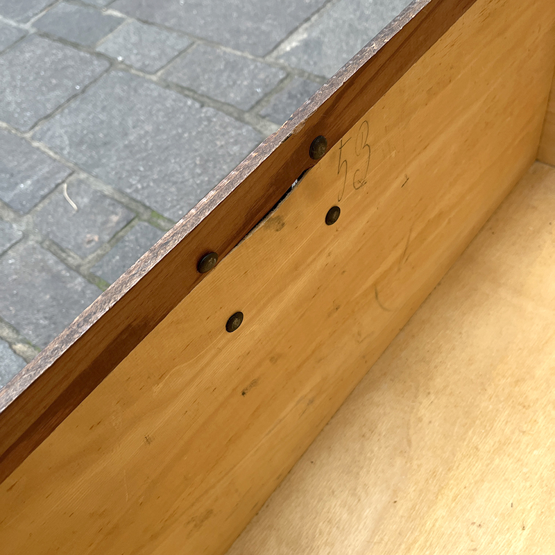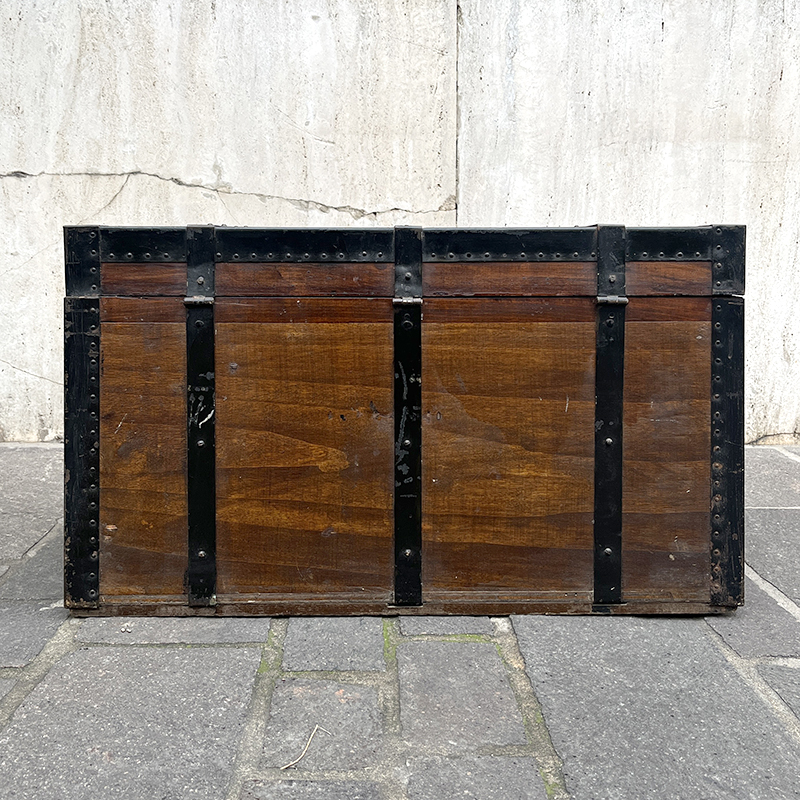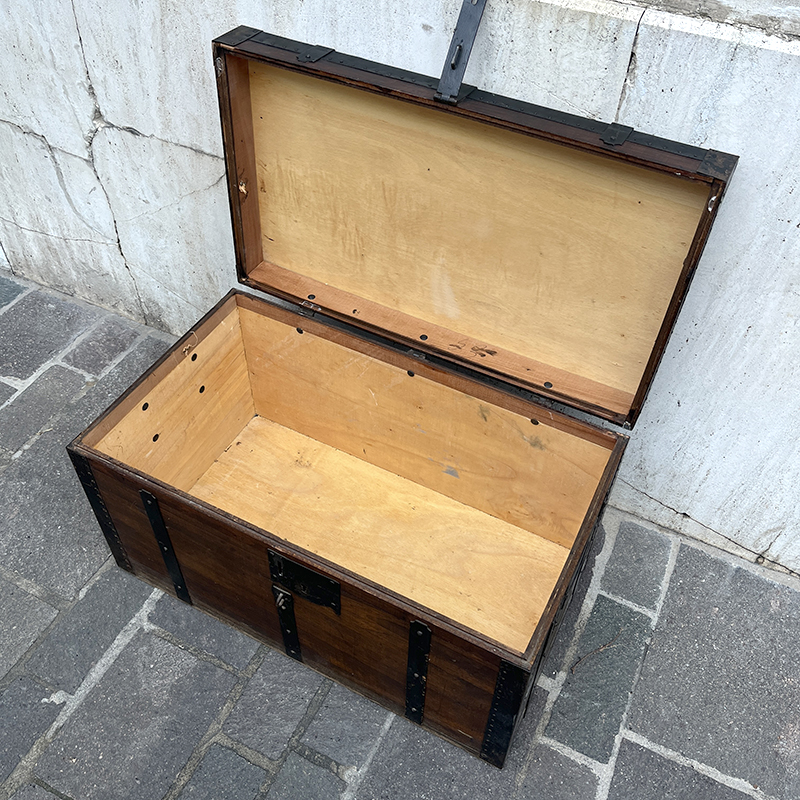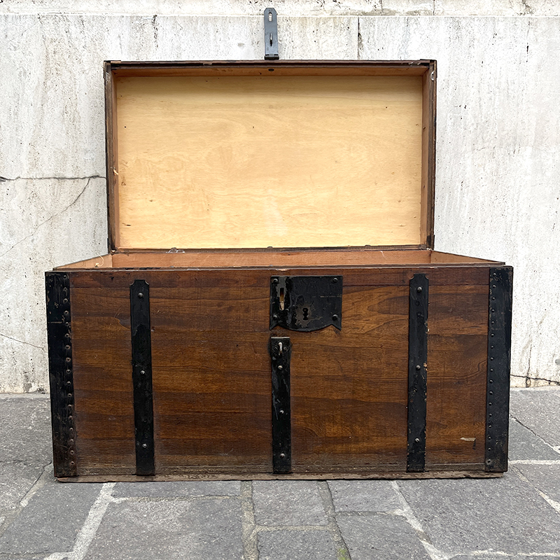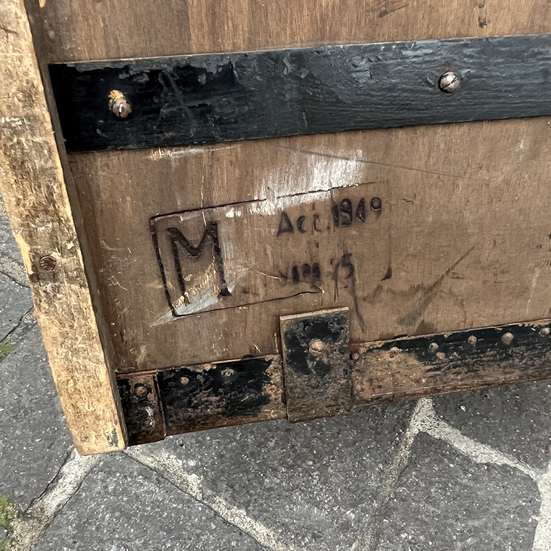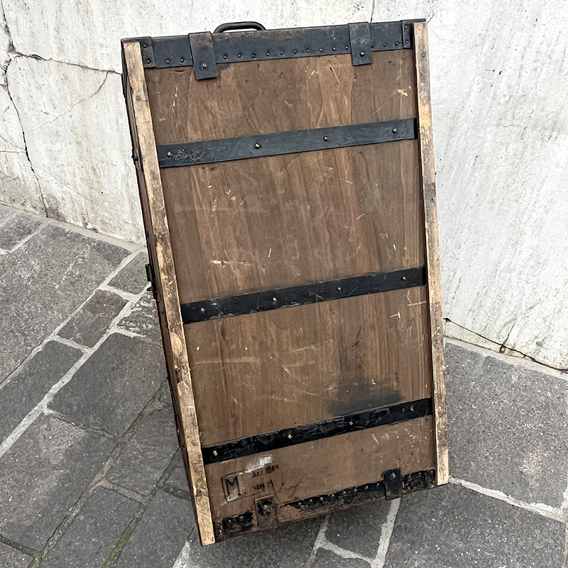 Baule in legno del 1949 con bordi, rinforzi e chiusura in ferro. Lateralmente ha due maniglie a scomparsa per il trasporto, sempre in ferro.