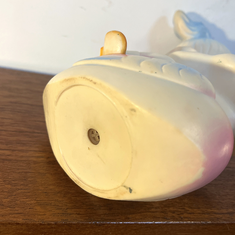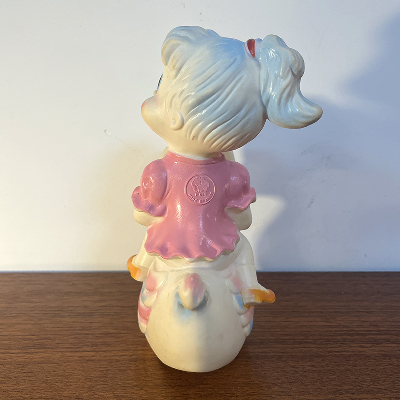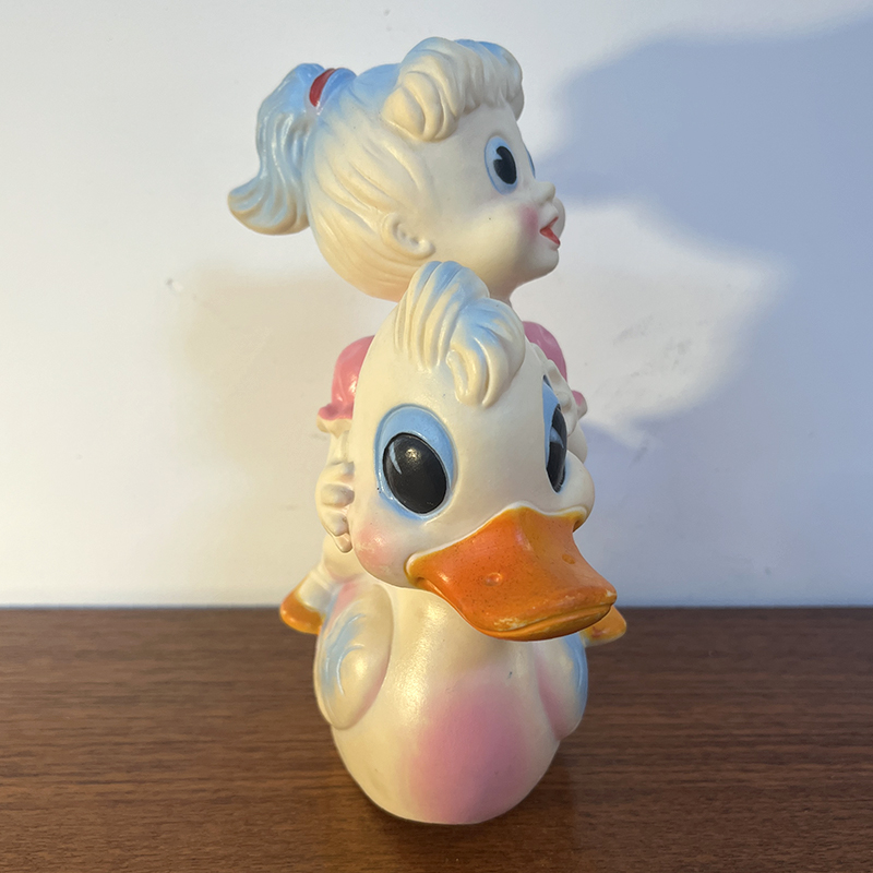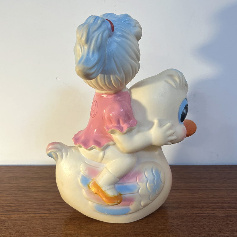 Dolcissima pupazzo in gomma raffigurante una bimba Ledraplastic a cavallo di una paperella.