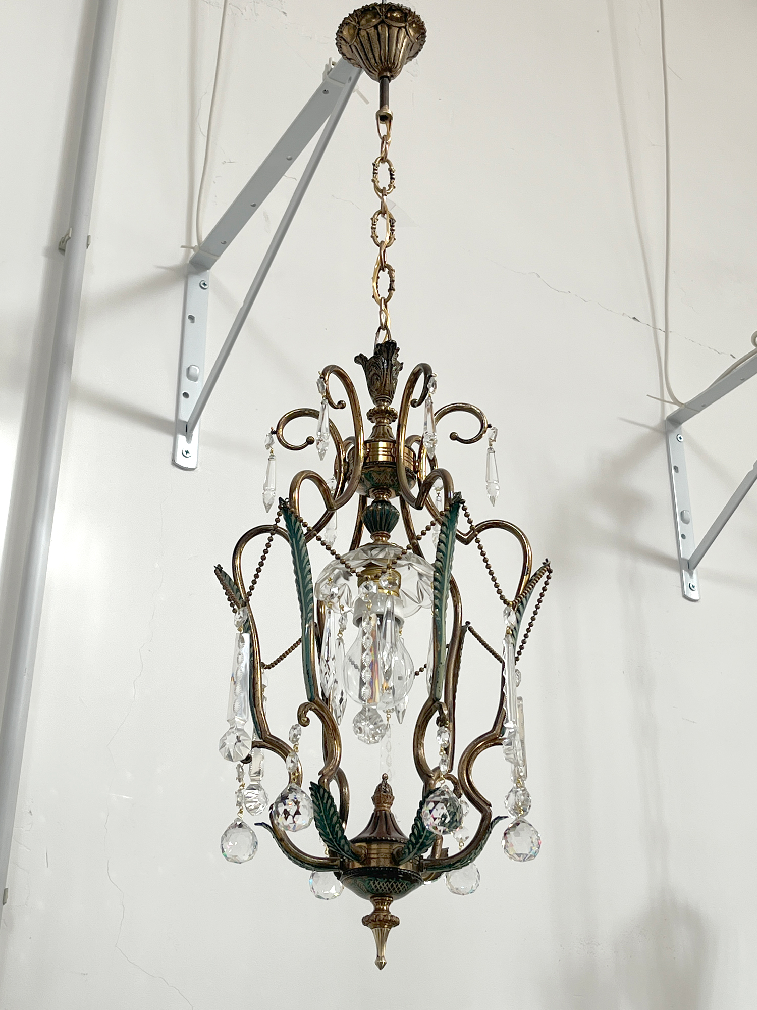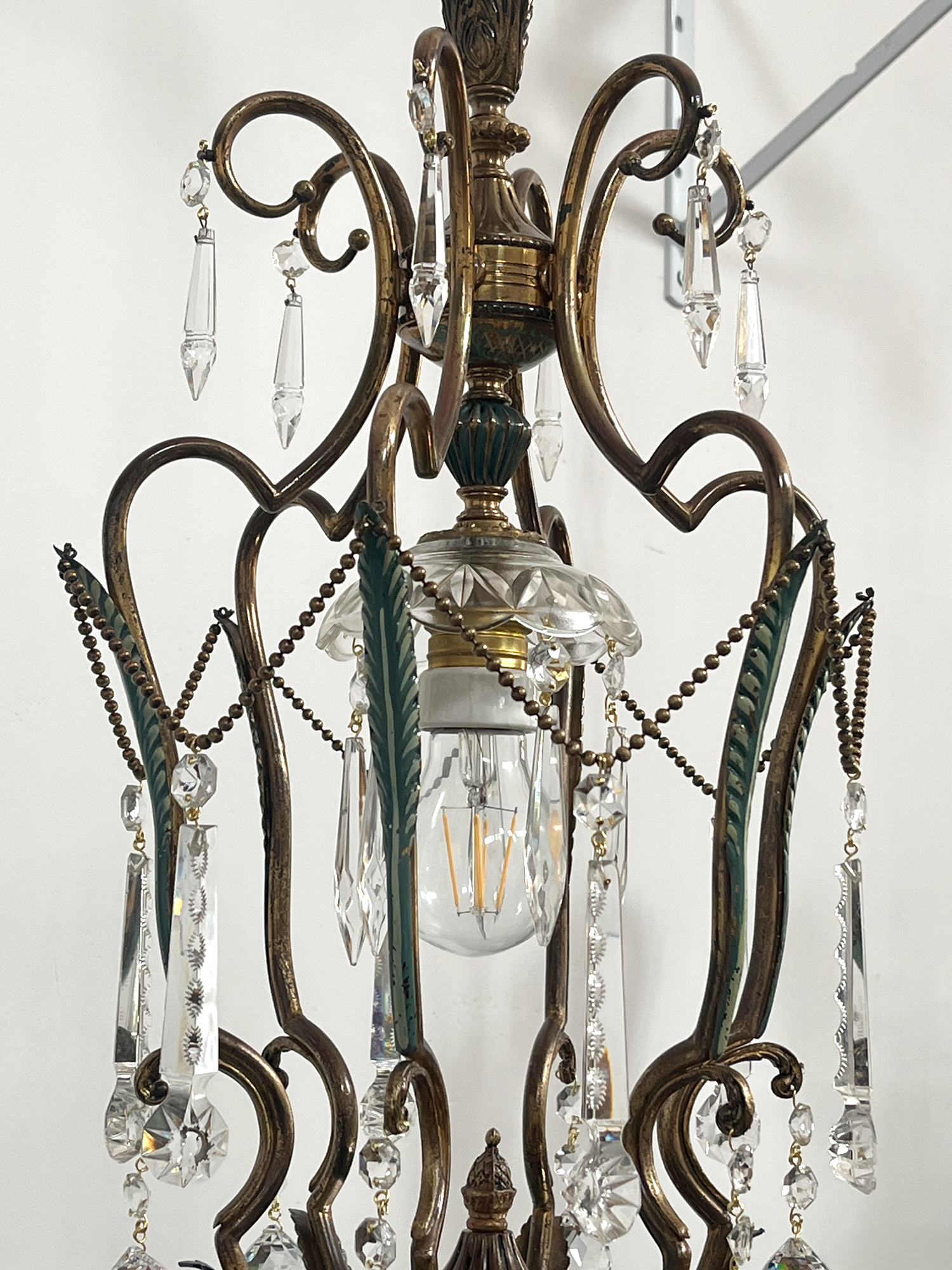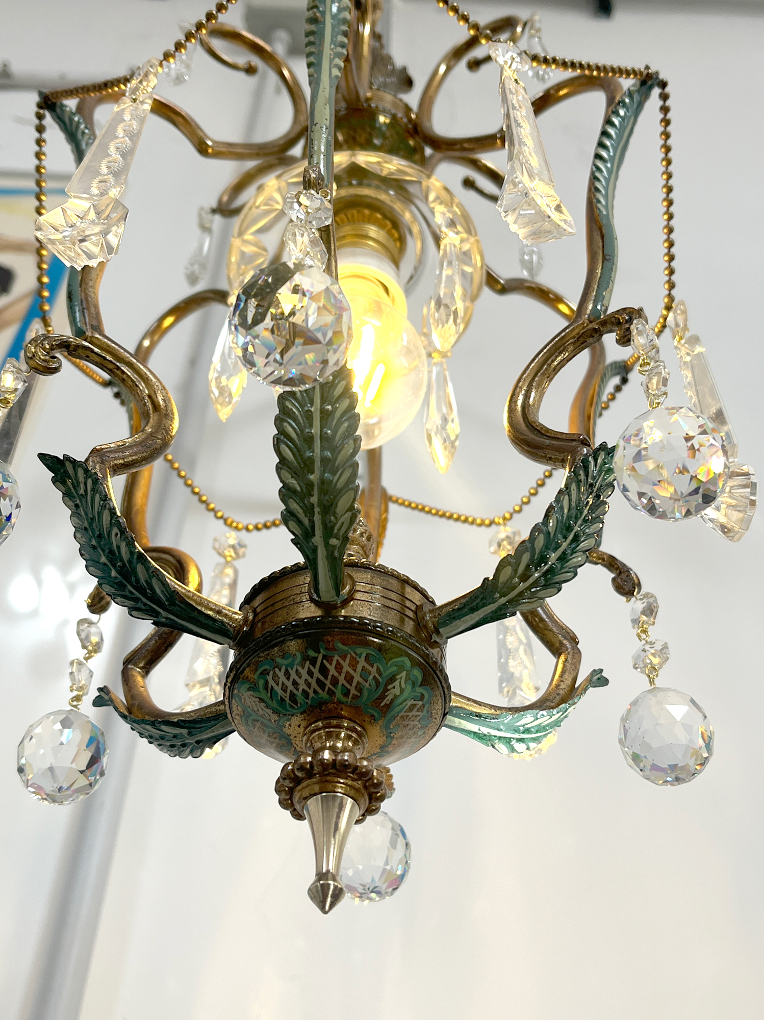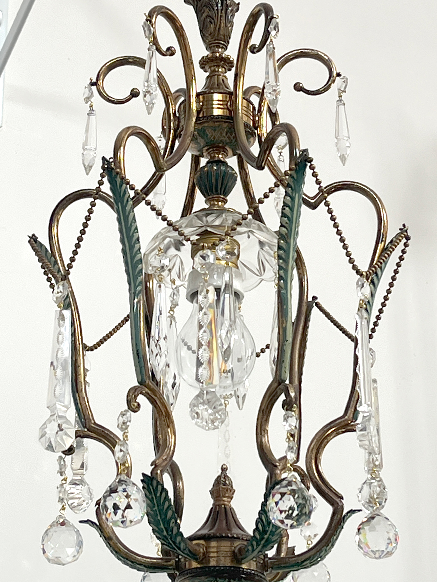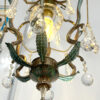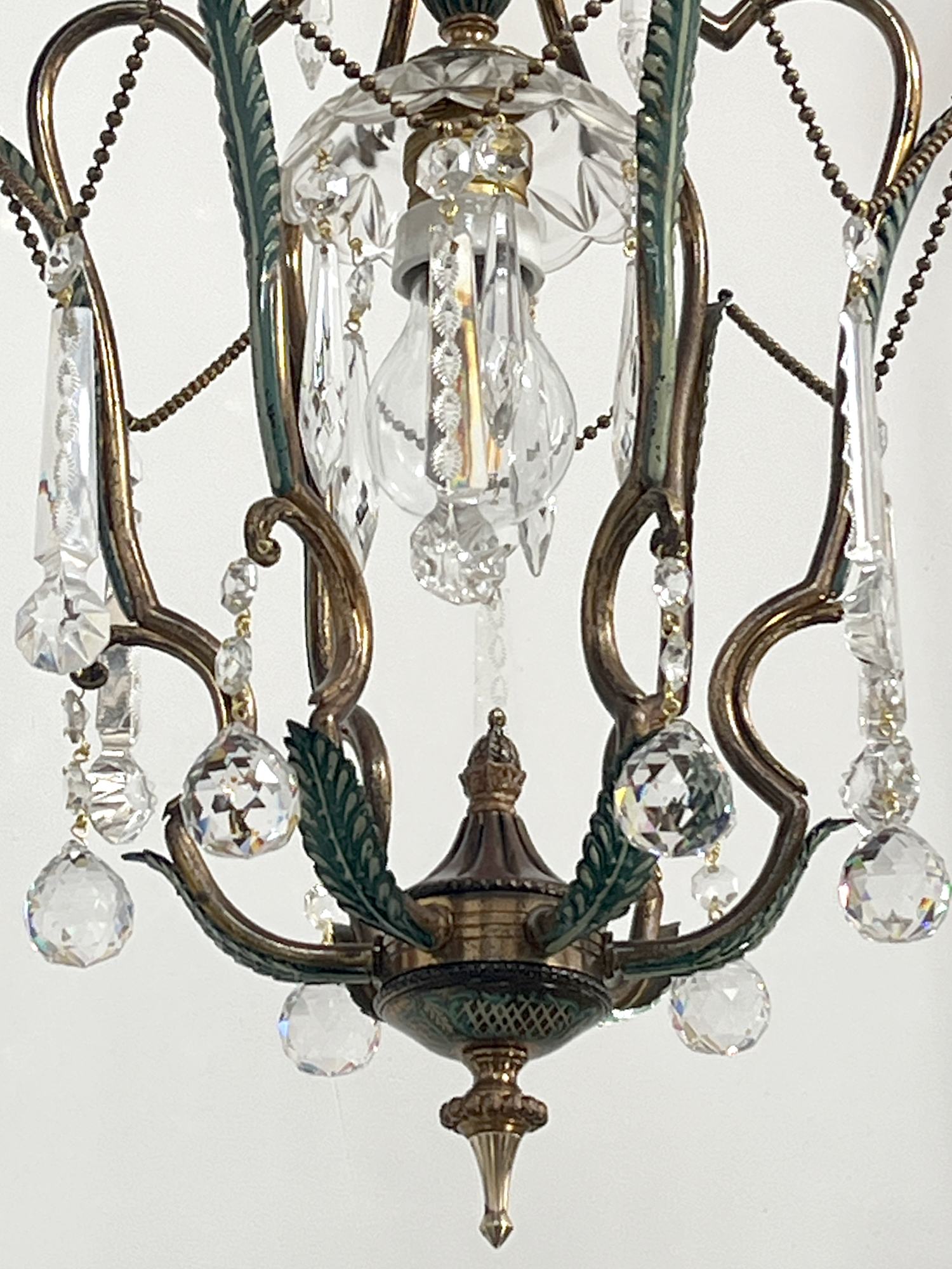 Bellissimo chandelier a cestino ad una luce con struttura in ottone smaltato. Infatti la parte inferiore delle foglie รจ colorata di verde acquamarina. Anche la cupola di chiusura inferiore รจ finemente decorata in verde.