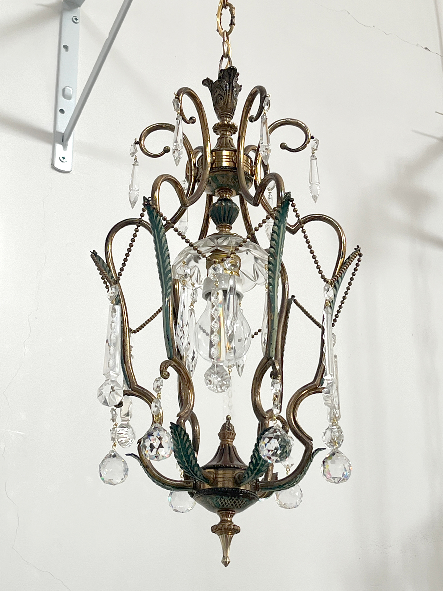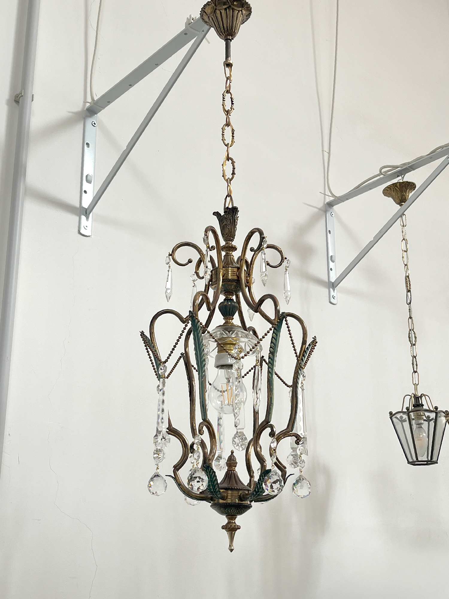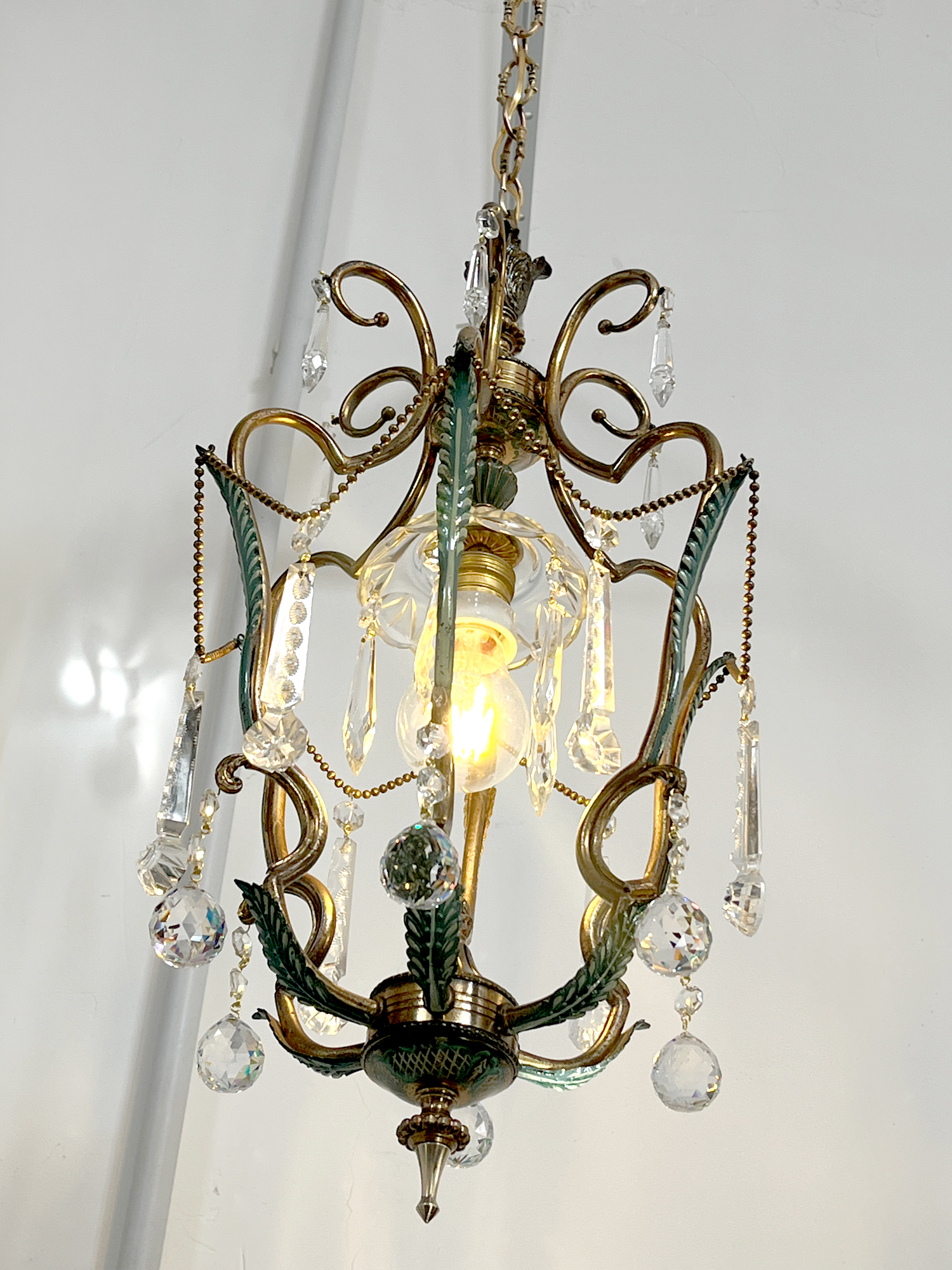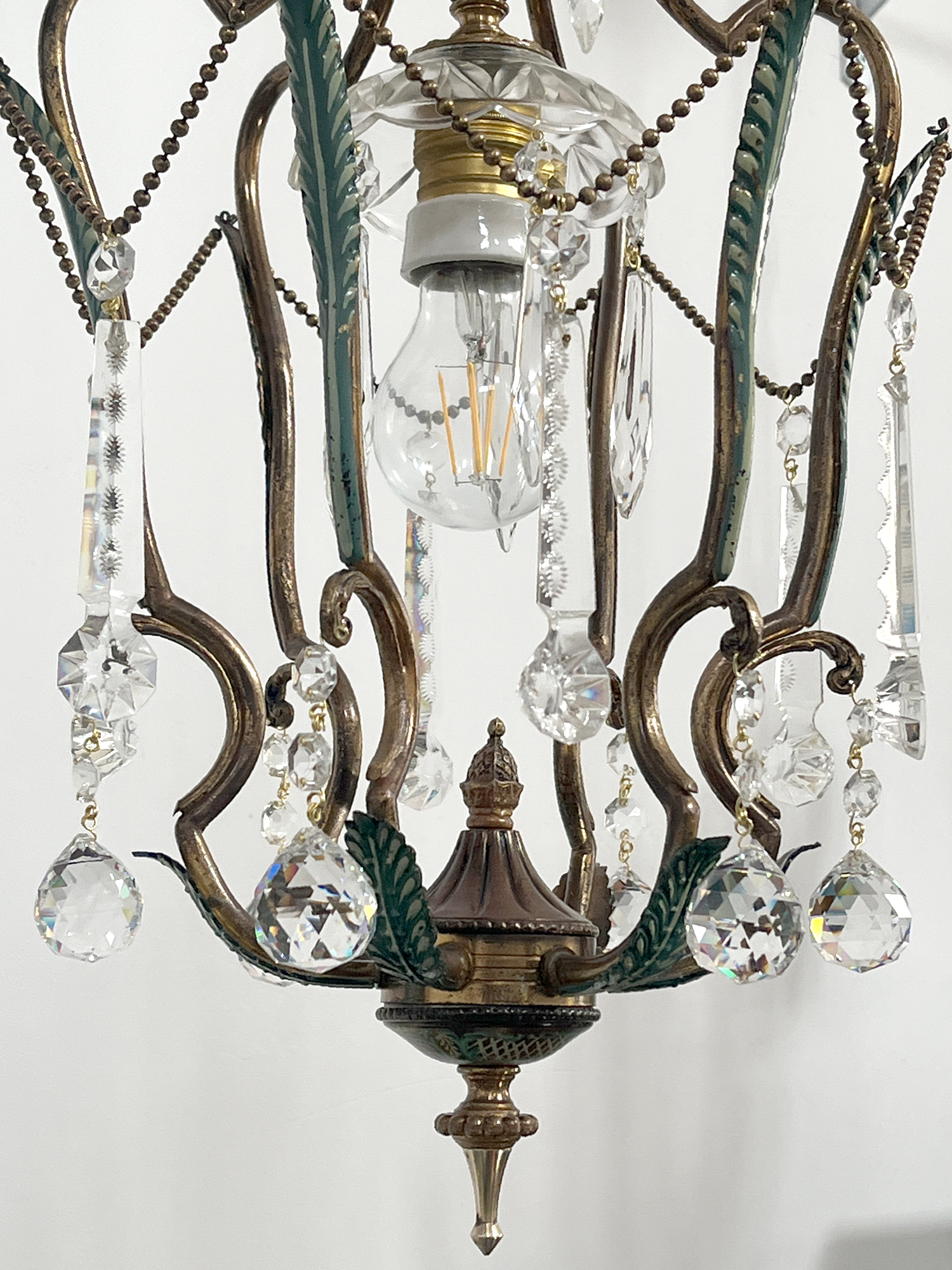 La struttura, pulita e ricablata, รจ stata protetta con un trasparente acrilico per preservarne la durata. Le catenelle fatte di piccole sfere di ottone da cui pendono le gocce in cristallo rendono questa forma a cestino piuttosto insolita. Tutti i pezzi sono originali.