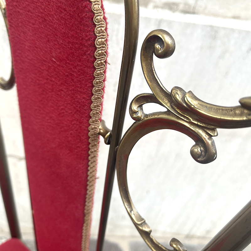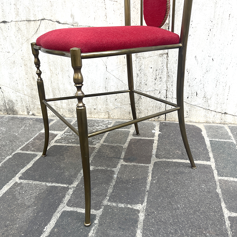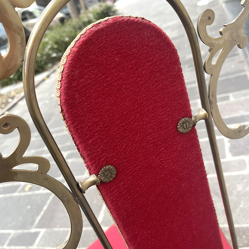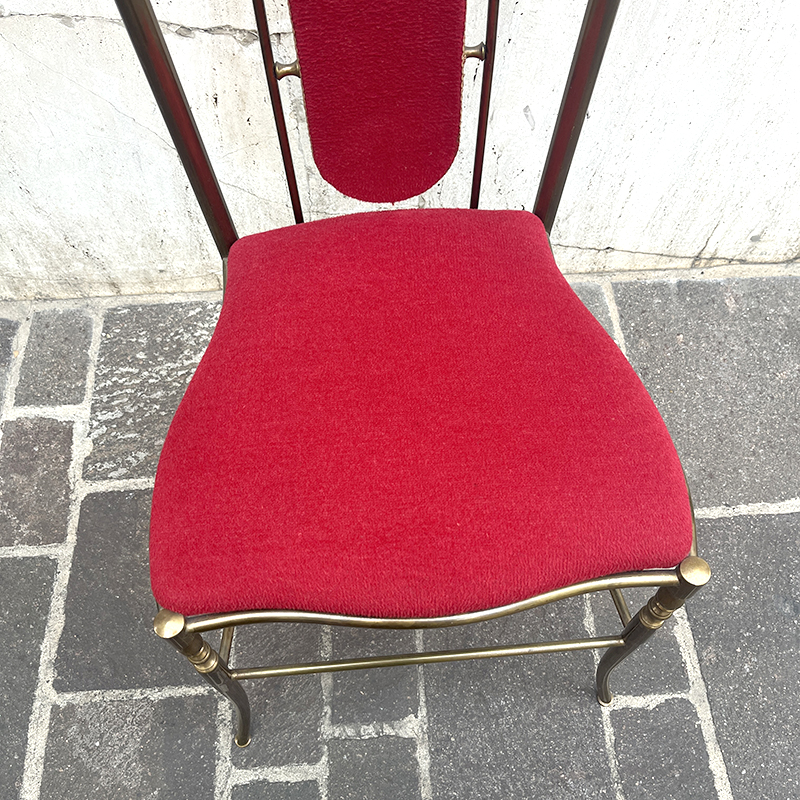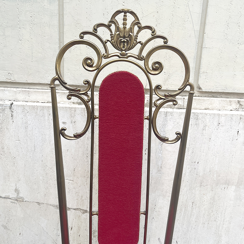 Sedia ottone e velluto rosso anni ’60/70 italiana. Ha una struttura in ottone (o lega con ottone) pesante e solida che rende la sedia stabile e robusta. In ottime condizioni di conservazione, la sedia รจ stata solo pulita. La stoffa di velluto della seduta e dello schienale รจ integra, in un vibrante color rosso porpora, rifinita con passamaneria dorata.