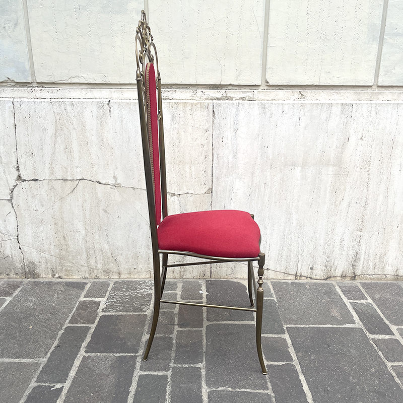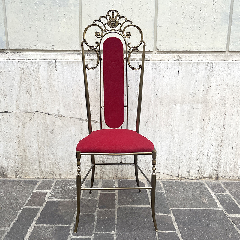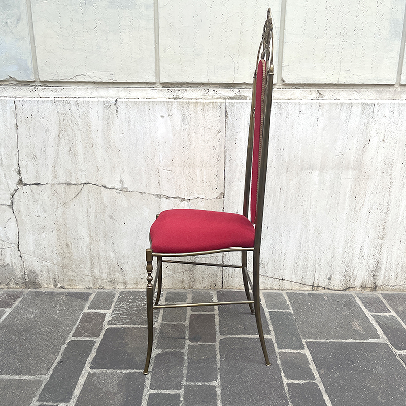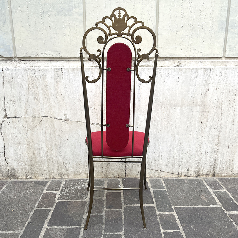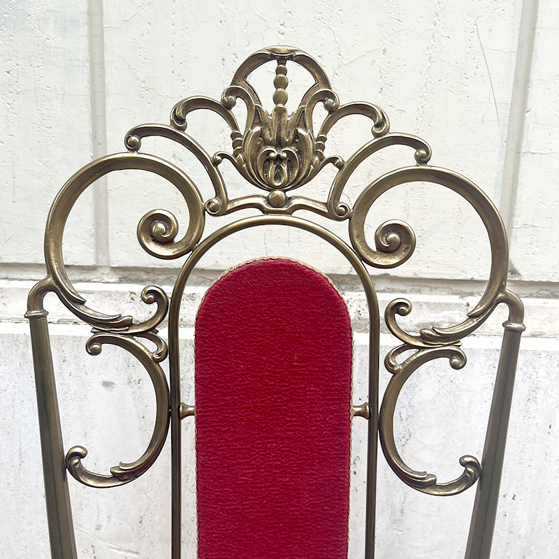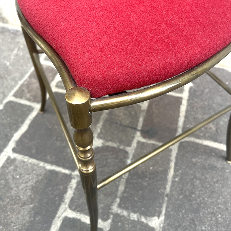 Sedia ottone e velluto rosso anni ’60/70 italiana. Ha una struttura in ottone (o lega con ottone) pesante e solida che rende la sedia stabile e robusta. In ottime condizioni di conservazione, la sedia รจ stata solo pulita. La stoffa di velluto della seduta e dello schienale รจ integra, in un vibrante color rosso porpora, rifinita con passamaneria dorata.