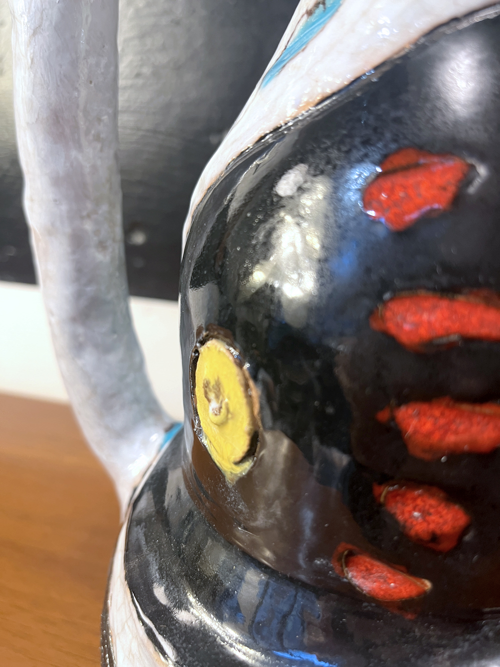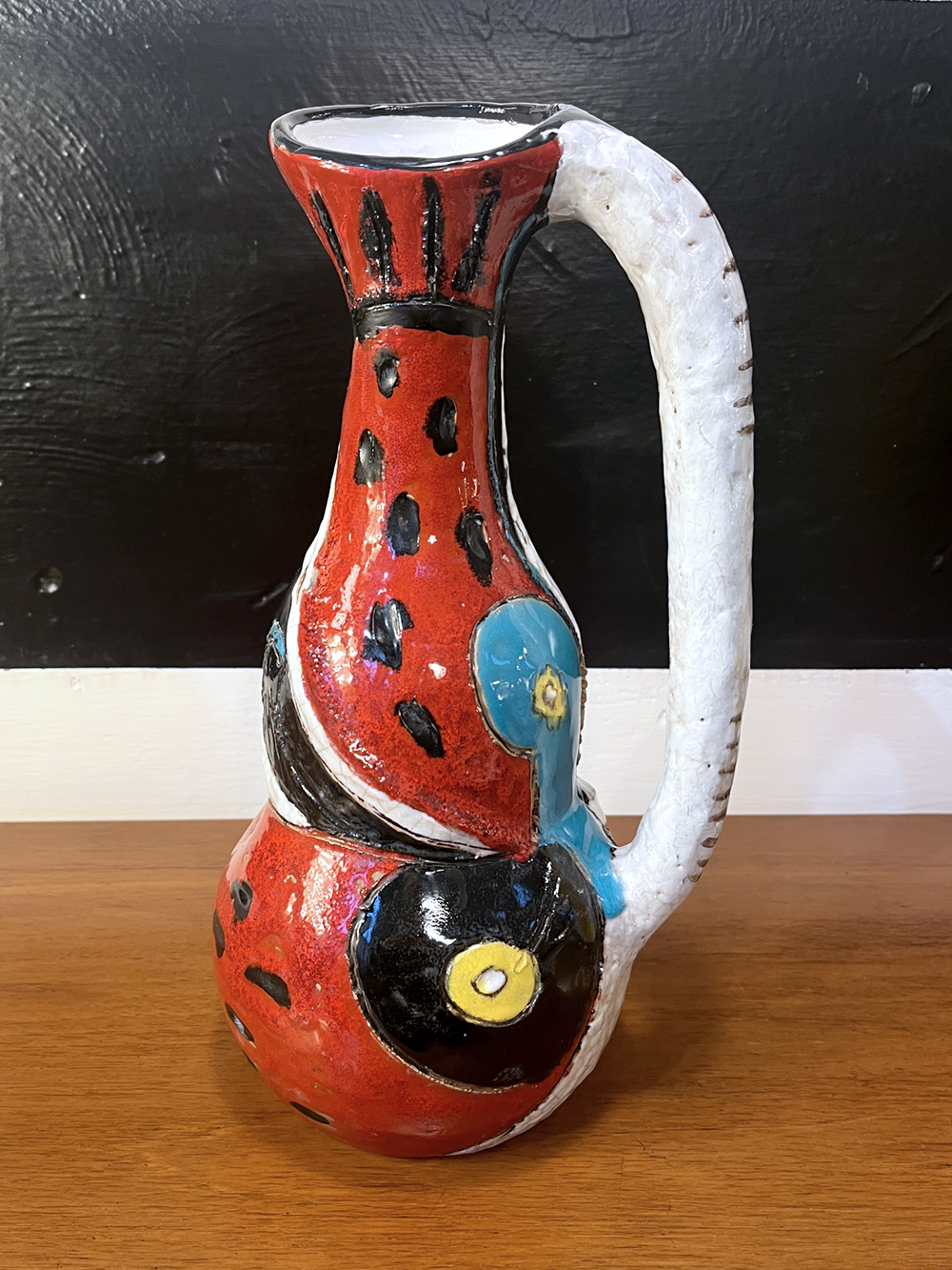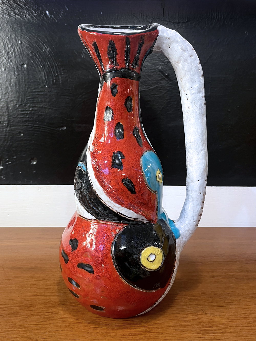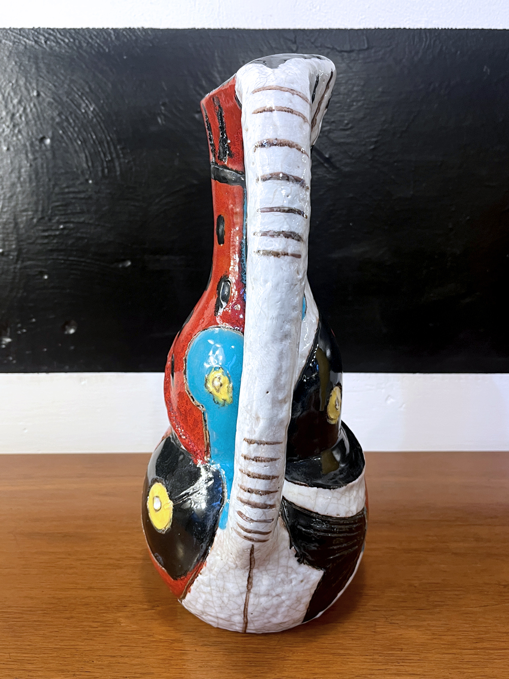 Realizzato nell’ambito della manifattura fiorentina fondata da Eugenio Pattarino alla fine degli anni ’30, questo vaso testimonia un aspetto meno noto ma particolarmente significativo della sua produzione: la ricerca plastica e decorativa in chiave moderna. La forma è costruita con evidente sensibilità scultorea, derivata dalla formazione originaria dell’artista, e si sviluppa attraverso un equilibrio asimmetrico tra corpo e ansa, che assume un ruolo strutturale e non meramente funzionale.