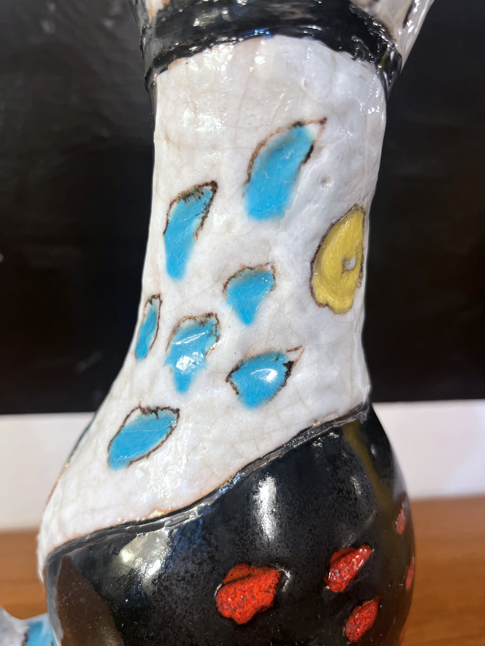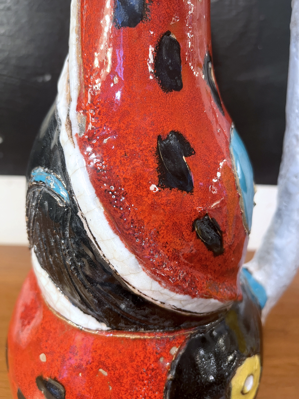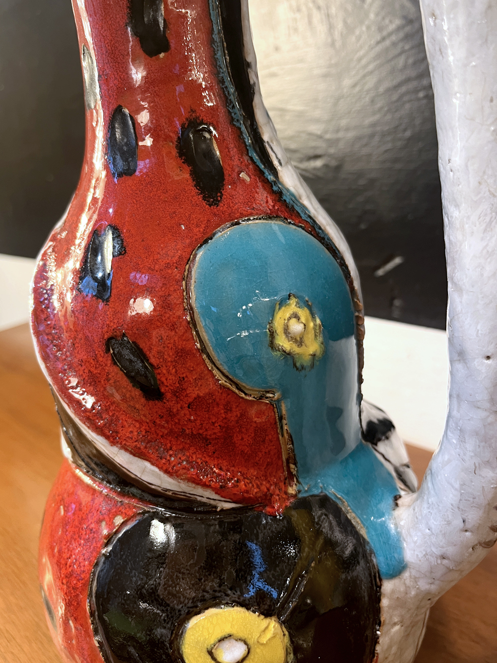La superficie è caratterizzata da smalti spessi e vibranti, applicati su fondo chiaro opaco, secondo una pratica tipica della ceramica fiorentina del dopoguerra. Il linguaggio decorativo si distacca dalla tradizione figurativa per adottare un lessico astratto, fatto di segni elementari e campiture cromatiche primarie, che richiamano suggestioni arcaiche e primitiviste. In questo senso, l’opera si inserisce nel clima di rinnovamento della ceramica italiana del secondo dopoguerra, in dialogo con le esperienze più sperimentali dell’area fiorentina, pur mantenendo una dimensione accessibile e decorativa.
